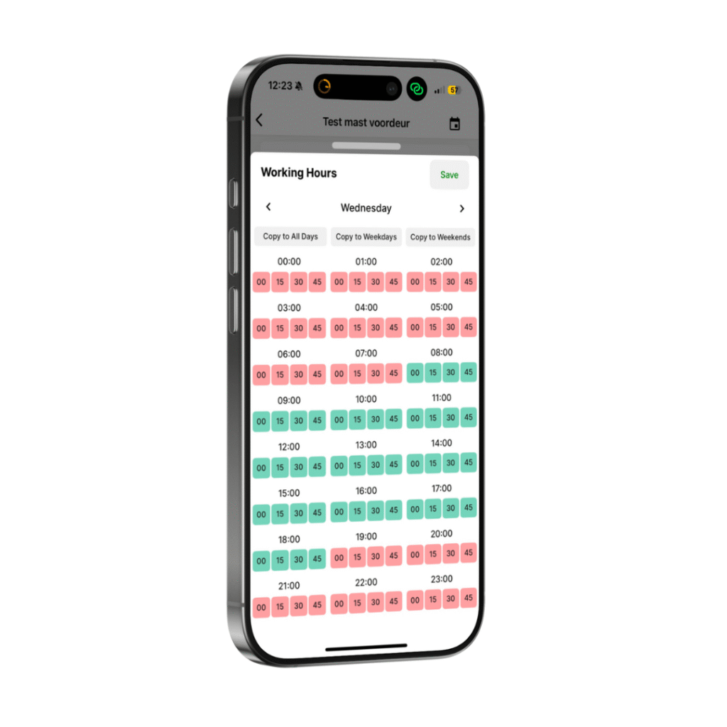 Met de werktijdenfunctie bepaal je eenvoudig wanneer de mast actief is. Je stelt dit in per dag en per kwartier, zodat je het alarm precies kunt afstemmen op werktijden, pauzes en nachten. Voor uitzonderlijke situaties, zoals overwerk of vakanties, gebruik je de Smart Disarm functie: hiermee schakel je het systeem tijdelijk uit voor 15, 30 of 45 minuten zonder het schema te wijzigen.