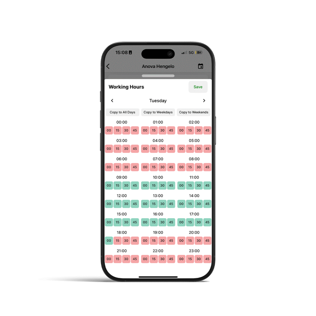 Met de werktijdenfunctie bepaal je eenvoudig wanneer de mast actief is. Je stelt dit in per dag en per kwartier, zodat je het alarm precies kunt afstemmen op werktijden, pauzes en nachten. Voor uitzonderlijke situaties, zoals overwerk of vakanties, gebruik je de Smart Disarm functie: hiermee schakel je het systeem tijdelijk uit voor 15, 30 of 45 minuten zonder het schema te wijzigen.